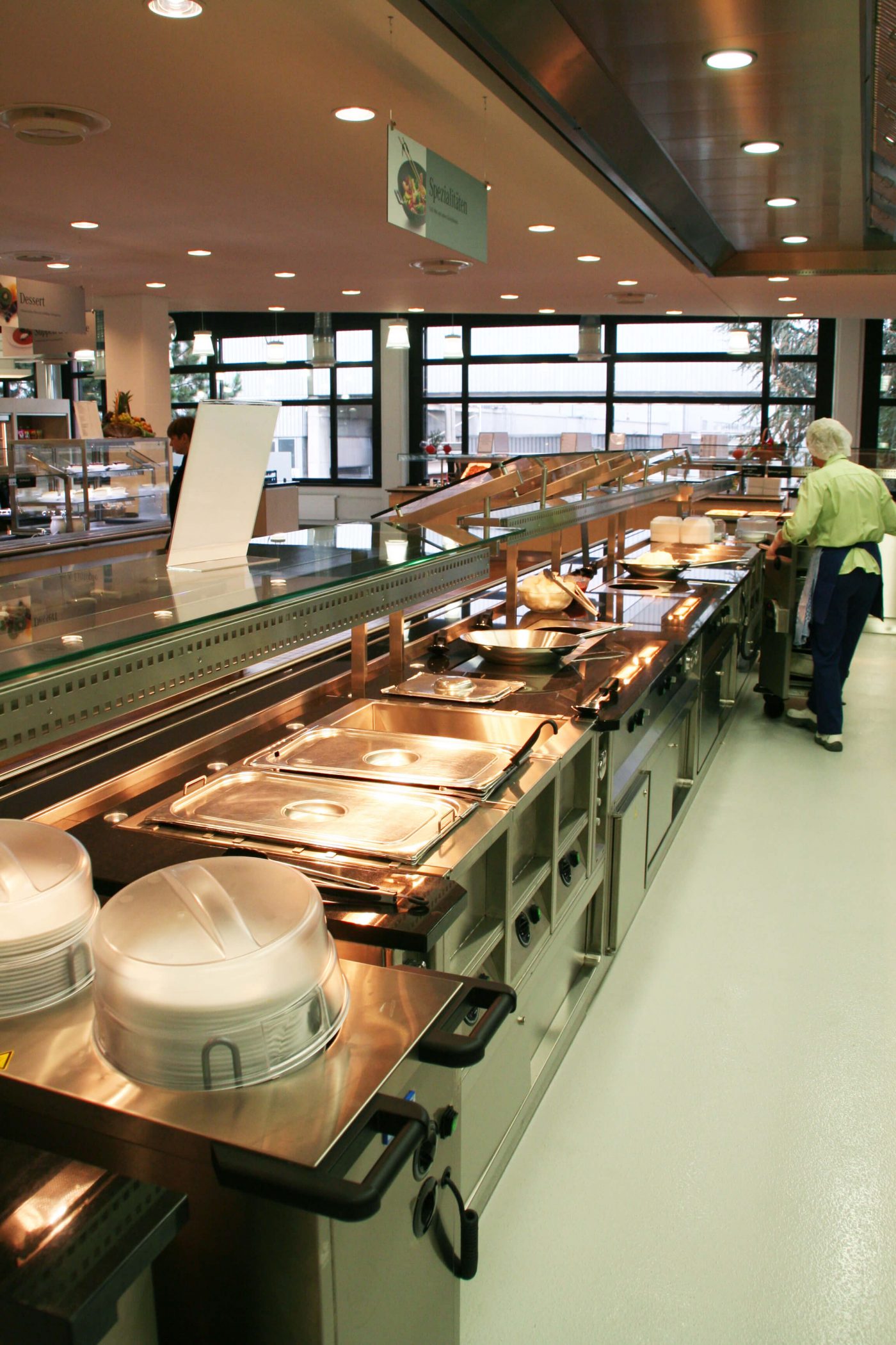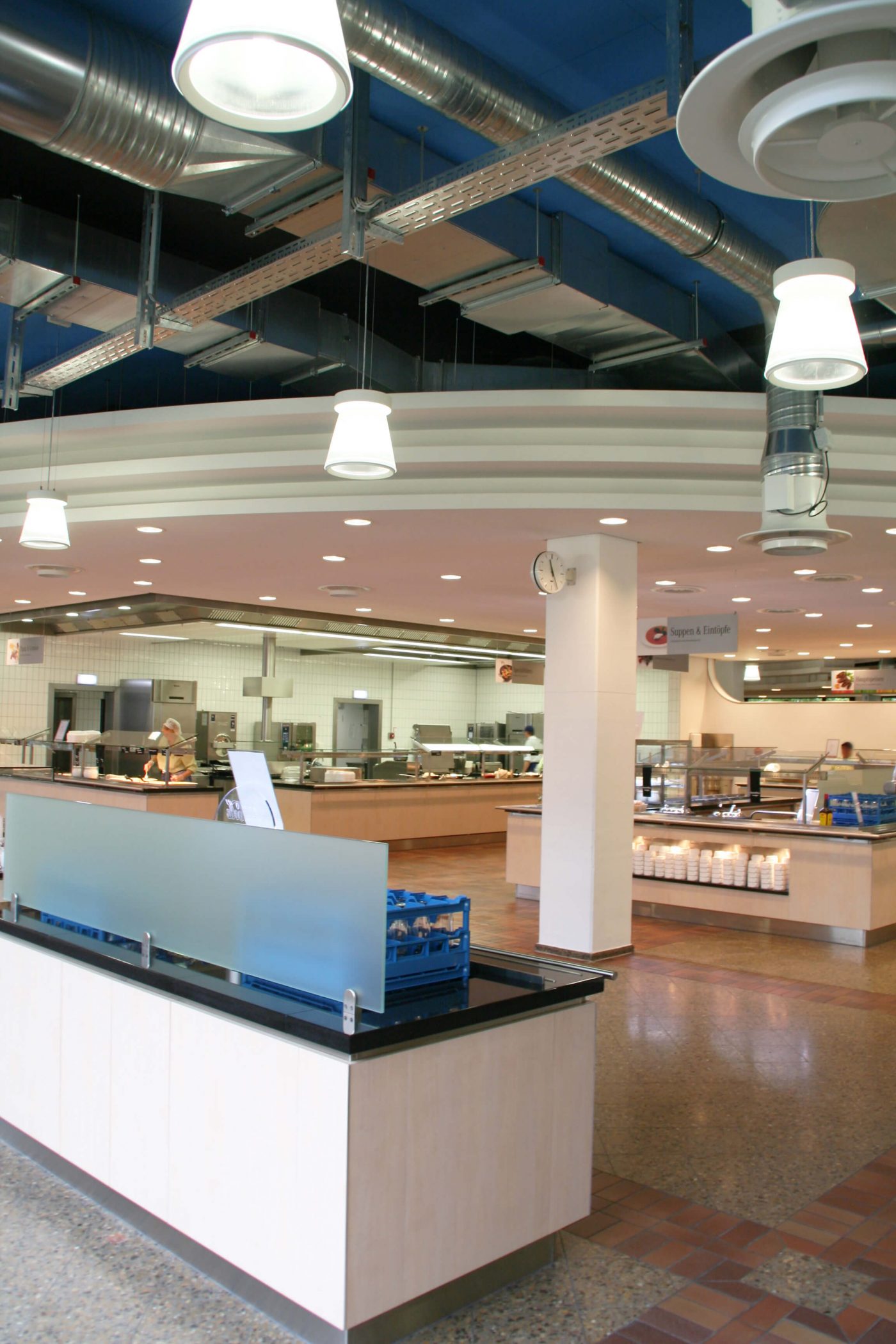 Das Projekt beinhaltete die Planung des gastronomischen Bereiches mit Umbau der Speisenausgabe im Erdgeschoss, eine optimierte Anbindung zur Produktionsküche im Untergeschoss sowie eine neue Coffee Lounge.