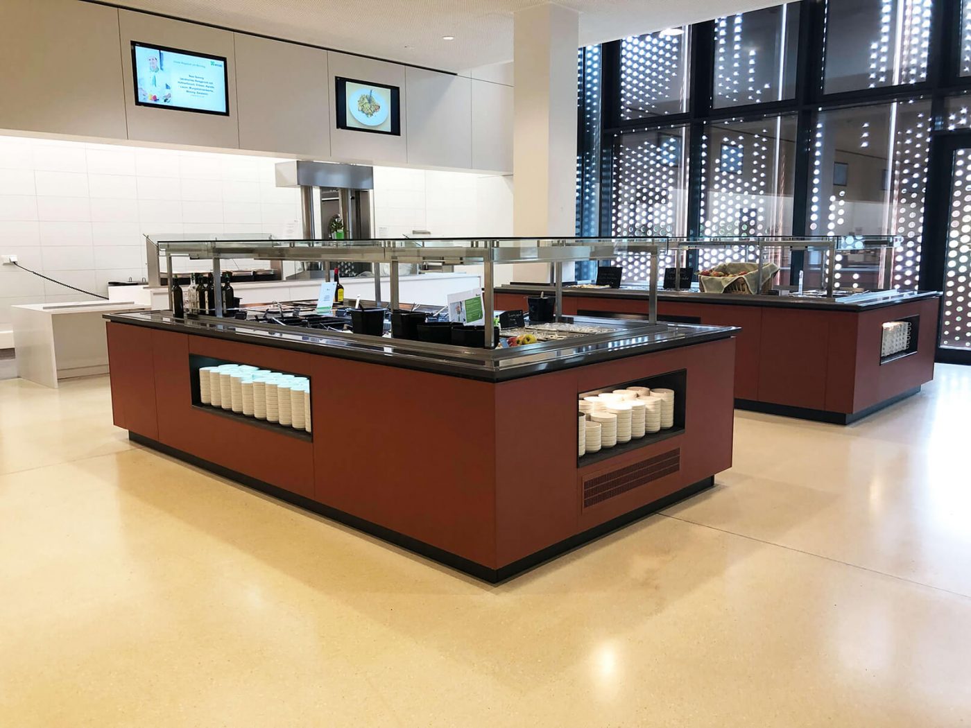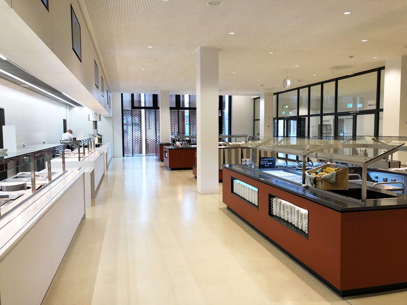 Das Erdgeschoss mit Anlieferung und Umpackbereich, Mitarbeiterumkleiden und Lagerbereiche. Im Untergeschoss wurden die Kleinkälteanlage und die Nassmüllentsorgung untergebracht. Im 1.Obergeschoss wurde die komplette Küche incl. Vorbereitung, Speisenausgabe und Spülbereich geplant.