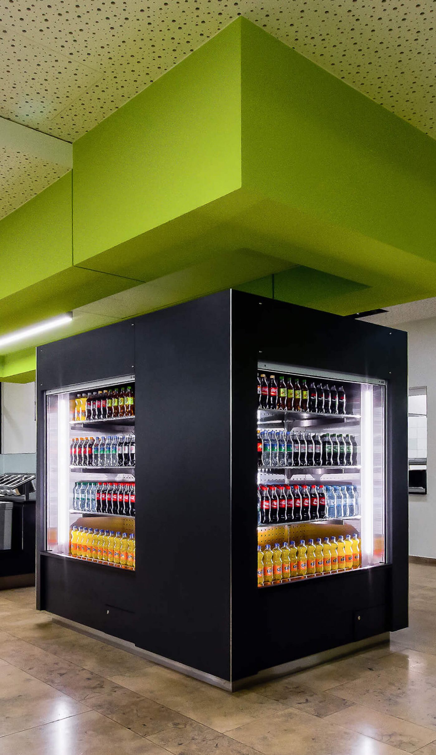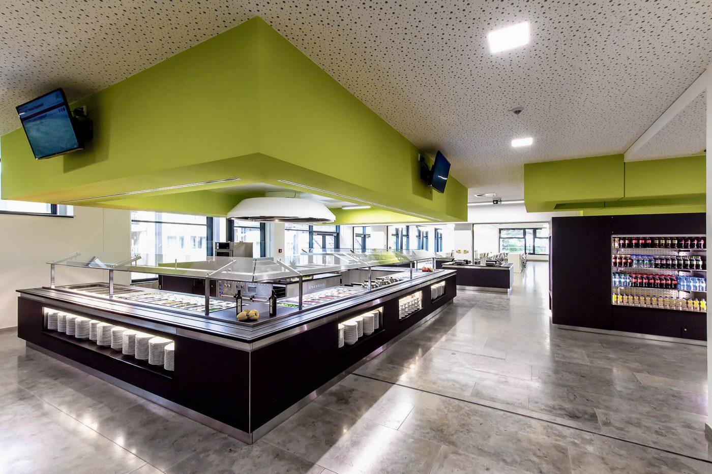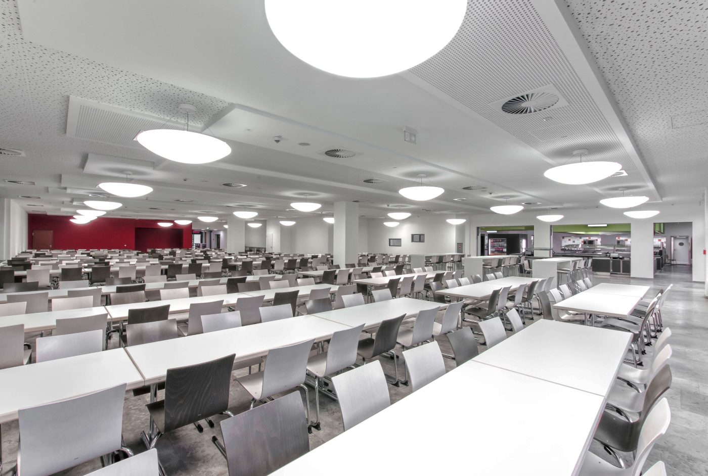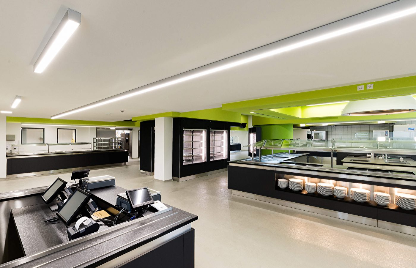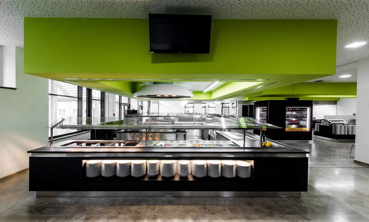 Die Campo ist mit einer Kapazität bis zu 6.000 Essen täglich ausgelegt. Eine der vielen Besonderheiten: Zwei Restaurants mit viel Wahlfreiheit auf zwei Ebenen. Unten das Themenrestaurant mit wechselnden Angeboten, Pastamanufaktur, Pizzastation, Front-Cooking, der EssBar und der Grillstation, dazu das Café Campo. Oben diverse autarke Counter für den eiligen Gast, auch ein VitalCounter für vegetarische und vegane Speisen. Dazu alles rund um den Megatrend to go und Snacking, etwa im stylischen Snack-Würfel mitten im Raum platziert.