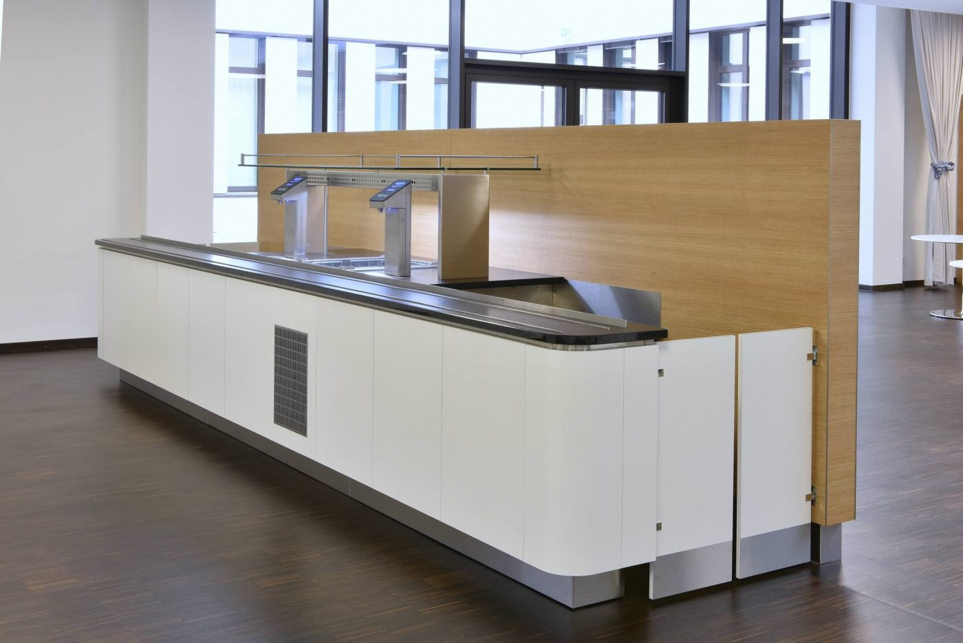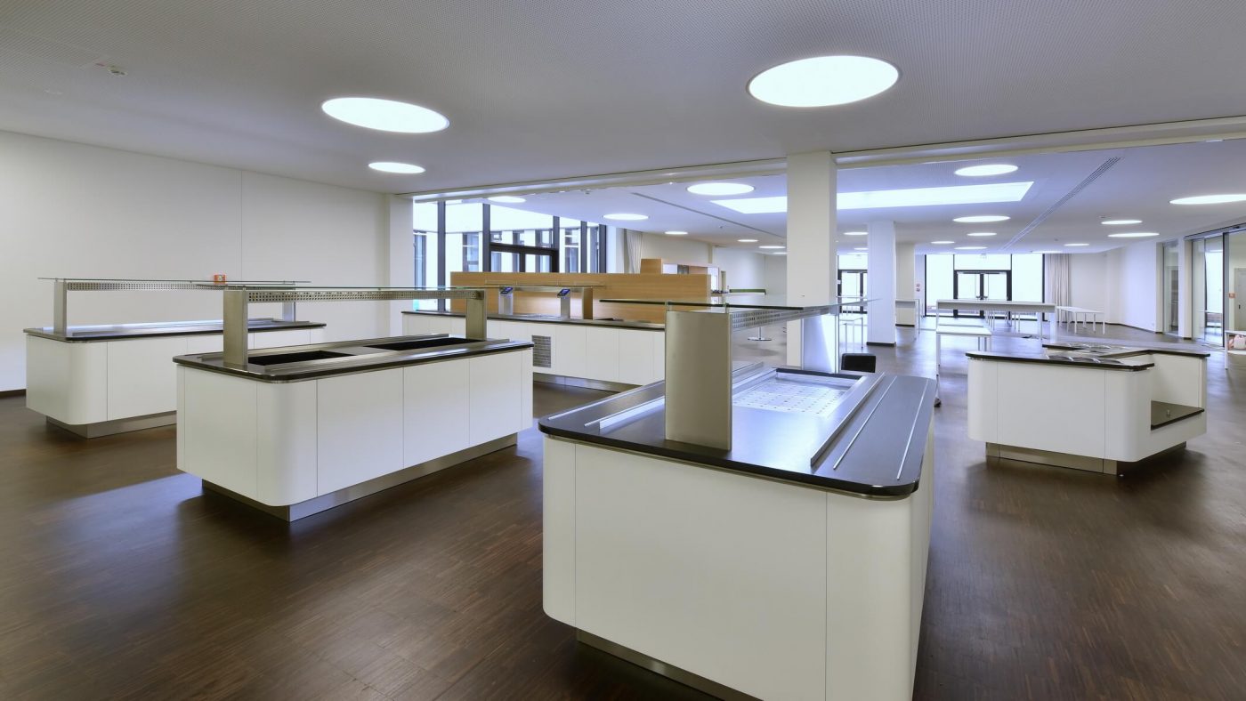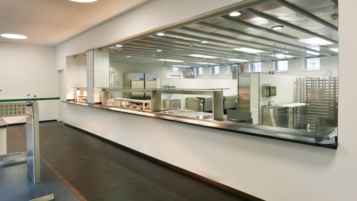 Eine moderne Betriebsgastronomie mit individuell konzipierten Features: Ein schick gestaltetes Raumkonzept mit Highlights wie Parkettfußboden, dazu ein effizient-hochwertiges Multifunktionskonzept für die Speisenausgabe: Eine offene Küche, die Speisenausgabe, der Speisesaal und Cafeteria – alles in einem Raum. Vom Bräter zur Ausgabe kurze Wege, die eine frische Produktion ermöglichen, insgesamt ein Konzept, das viel Transparenz bietet.