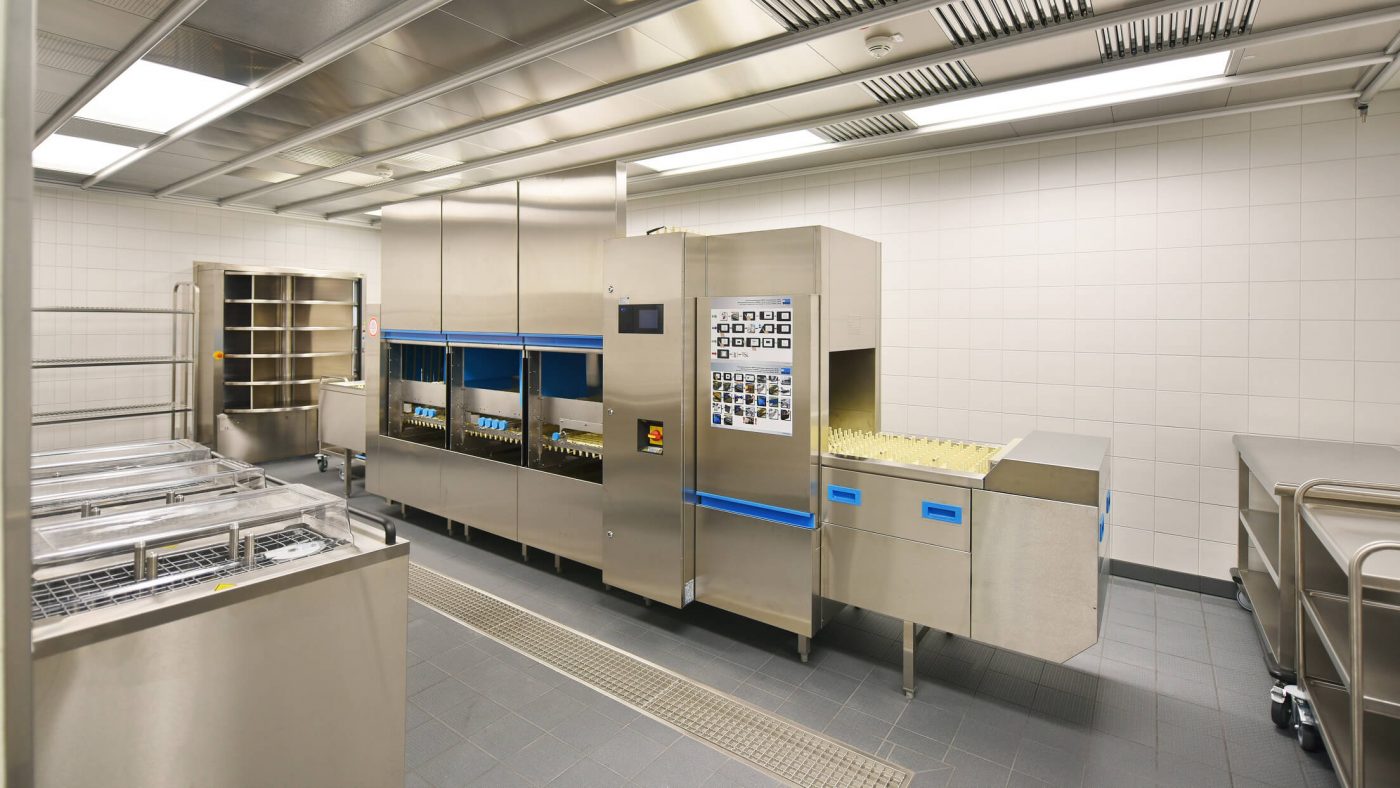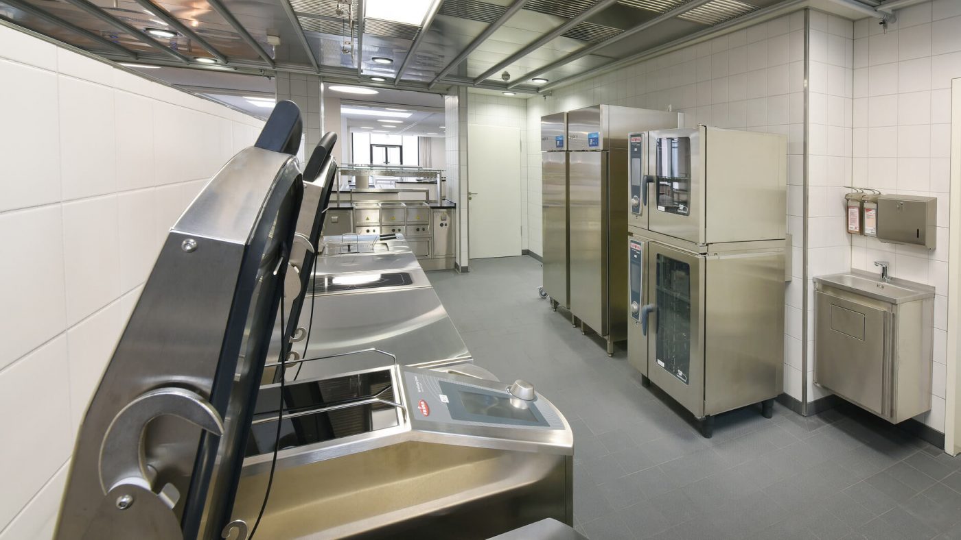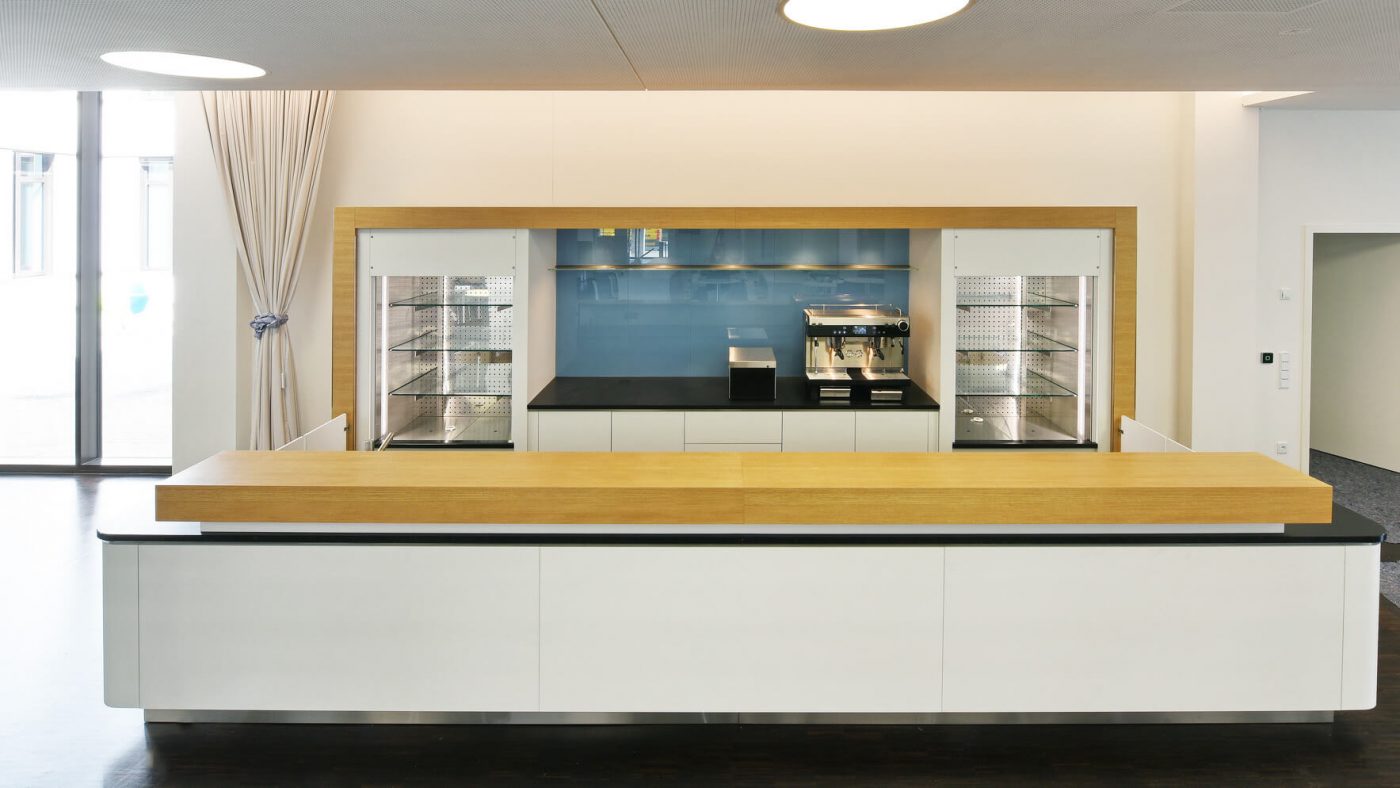 Eine moderne Betriebsgastronomie mit individuell konzipierten Features: Ein schick gestaltetes Raumkonzept mit Highlights wie Parkettfußboden, dazu ein effizient-hochwertiges Multifunktionskonzept für die Speisenausgabe: Eine offene Küche, die Speisenausgabe, der Speisesaal und Cafeteria – alles in einem Raum. Vom Bräter zur Ausgabe kurze Wege, die eine frische Produktion ermöglichen, insgesamt ein Konzept, das viel Transparenz bietet.